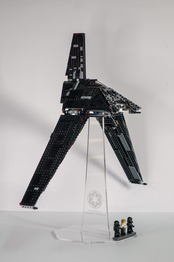 Pedestal acrílico con diseño a la medida para objetos de colección. Pueden incluir piezas originales Lego para soportar modelos de esa marca.